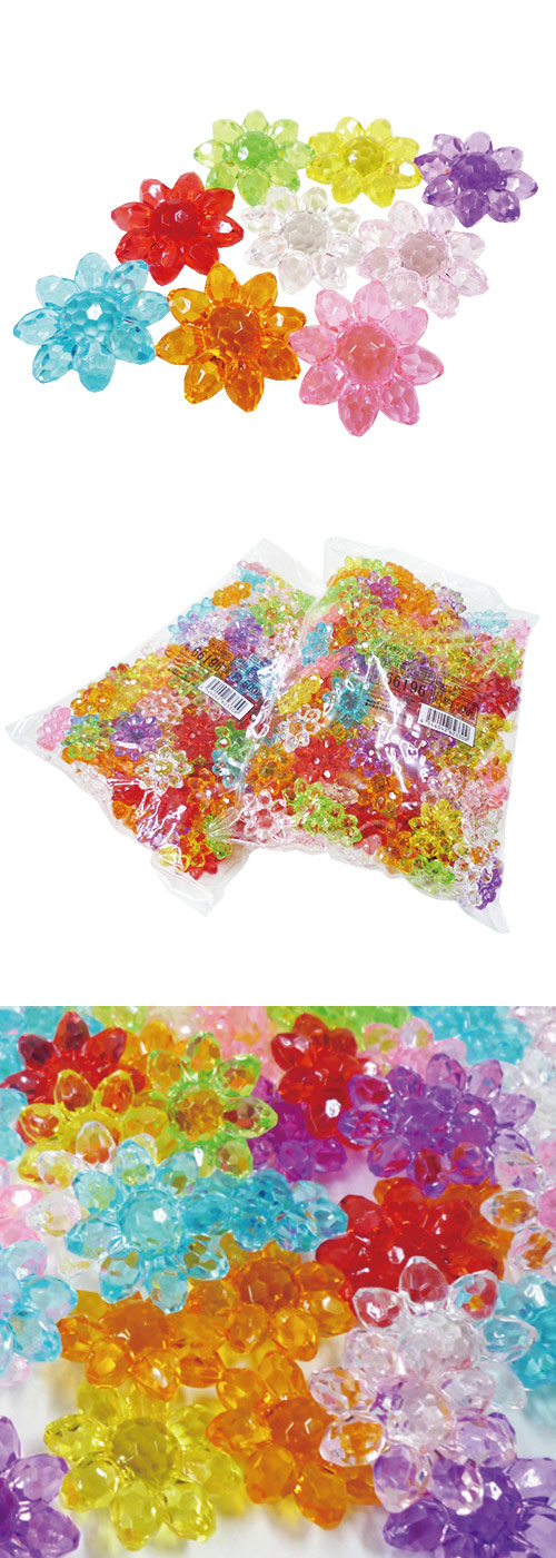 (1袋) お花の形のクラッシュアイス!すくいどり、つかみどりはもちろん、ゲームセンターディスプレイにもおすすめ♪ガチャカプセルに入れてガチャガチャの使用もおすすめ!色は8〜9色のアソートです。ミックスして目安個数160個/袋(500g)※水には浮きません |