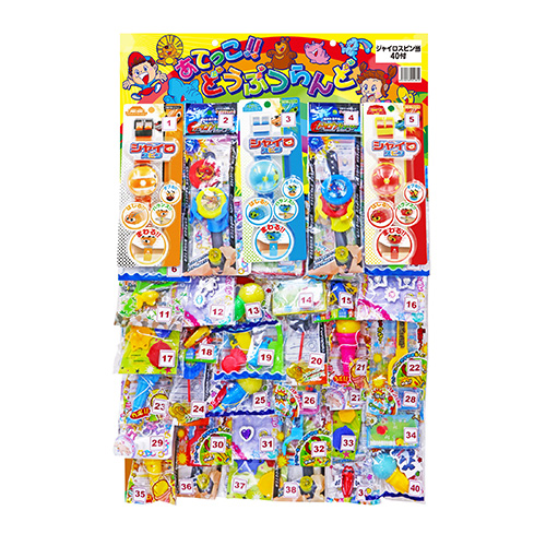 景品が40個付いた当てくじです。(くじ紙がついています。)あたりは人気の「ジャイロスピン」!番号くじを引いてどの景品が当たるかドキドキ楽しめる!ハズレも充実したおもちゃがついています。
