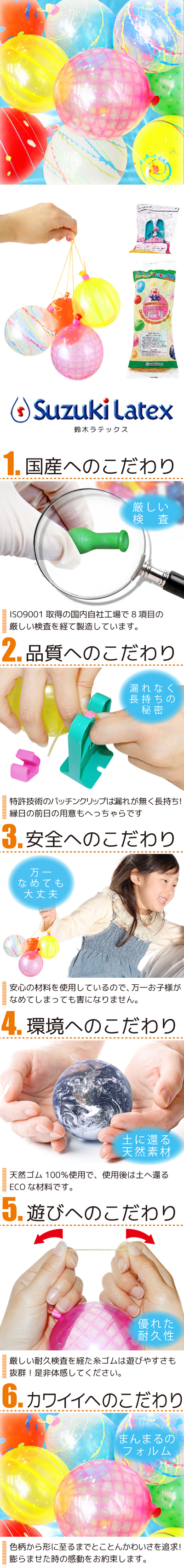 1)品質が良い 割れにくく、出来上がりが美しい形に仕上がります。 比較的作りやすいのも特徴です。 まんまるな水ヨーヨーを生産するのは高い技術が 要求されます。 2)種類の豊富さ 80年の歴史の中で様々な柄の鈴木ラテックスの 水ヨーヨーが生まれました。 懐かしい柄から可愛い柄まで様々な水ヨーヨーが 揃います。